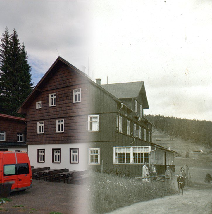 Lysečinská bouda (HL čp. 51) ve 30. letech 20. století a v roce 2022.