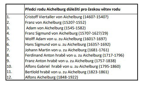 Nejstarší syn Franze Antona - Ferdinand Anton hrabě von u. zu Aichelburg (1788-1872) byl zakladatelem rakouské větve rodu Aichelburg, která vymřela roku 1928. Mladší syn Alfons Gabriel hrabě von u. zu Aichelburg (1795-1860) byl zakladatelem české větve rodu.
