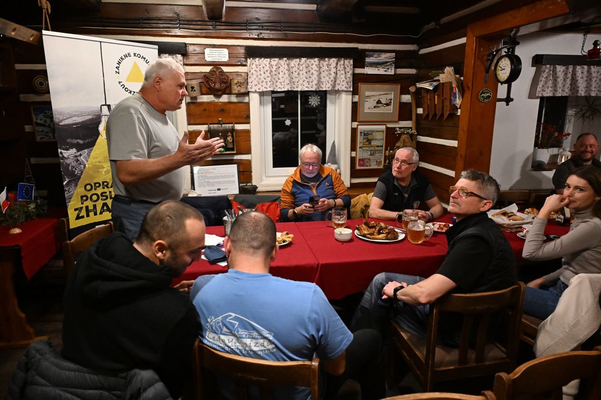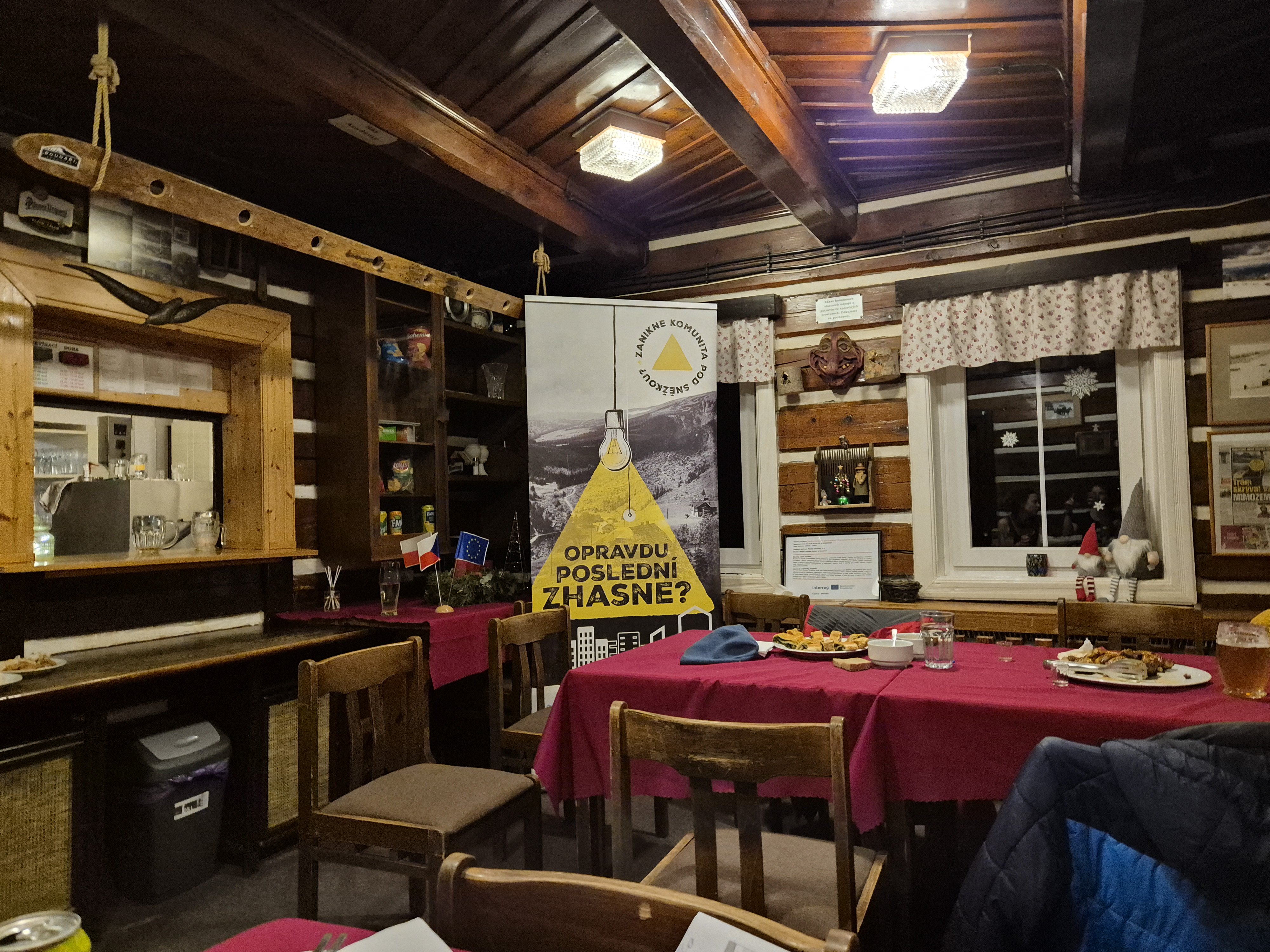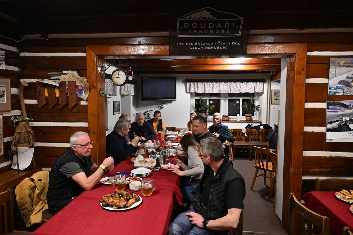 Ve středu 17. prosince večer jsme se vydali na boudu Racek v Peci pod Sněžkou. Uskutečnilo se tam setkání místních boudařů. "Boudaři Krkonoše" je neoficiální spolek majitelů či provozovatelů horských bud od Velké Úpy po Černý Důl. Klára za Paměť Krkonoš seznámila účastníky s probíhajícím projektem s názvem "Zanikne komunita pod Sněžkou?" a zdůraznila důležitost podobných spolků/ komunit/ subkultur k udržení kvalitního lokálního života. Na setkání dále promluvil předseda spolku Libor Konkolský, který ke konci své řeči vyzval osazenstvo k pozvolnému výběru jeho nástupce. Nezdálo se však, že by tento návrh někdo bral vážně :)